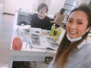 日曜日の朝からベテラン衛生士長が新人を伴いハンズオンセミナーに参加。