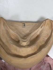 顎堤(歯の抜けた骨の頂上=堤防)が高く残っている場合は問題少ないが、義歯が合わない外れてしまう場合の殆どがこの骨の堤防が吸収し平に..時に陥没している場合も..義歯の吸着を妨げる難症例の舌の後退位(隙間が出来て空気が入り陰圧不足に)また、大きく口を動かす事が出来ずに加速される口腔機能の低下..改造義歯に時間をかけるのはこれらの機能を患者さん固有のベストポジションを導く為です。舌棚(舌が乗っかる形態)を作り、頬の内側の粘膜が義歯にまとわり付くよう、義歯の内と外から抑え込む形態を作っていきます。