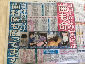 私達歯科医師は医科以上に感染リスクが高い職業と言われる。多くの大学病院は外来診療を休診、緊急対応のみとするが、かかりつけ医の役割を担う一般歯科はマスクや防護服不足の中、独自の感染防止策を取りながら診療を続けているところが多い。当医院も3つの密を避ける為、必要と思われる処置を優先に来院患者さんはマスク着用を義務化として玄関外で検温と問診、SPO2を測定後、発熱ある方には診療をお断りするケースを振り分けている。ソーシャルディスタンス(社会的きょり)を配慮しながら、次亜塩素酸水加湿器で空気の消毒や換気のために寒い日も窓を2方向以上に全開している。
