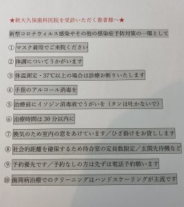 患者さんには上記の項目を受診前に説明し、ご協力頂いての診療体勢をとっている。