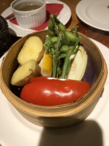 蒸した温野菜.パプリカ.ナス.枝豆.ズッキーニ.じゃがいも..をオリーブ油とニンニク、アンチョビで作るバーニャカウダソースをたっぷり付けて頂く(๑˃̵ᴗ˂̵) 冷たい物や冷房で冷え切った体にはNICE!! パスタはタリオリーニで。