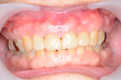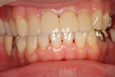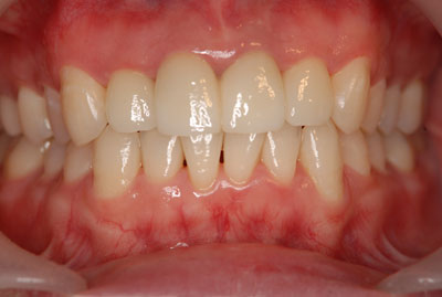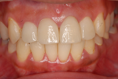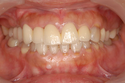 咬合高径は正常な範囲内だったので、上下のバランスを測ること、更に、下顎前歯部の歯冠延長術を行った。仮歯を装着し、歯周の治癒を待ちe-max(ステイン法)を装着。