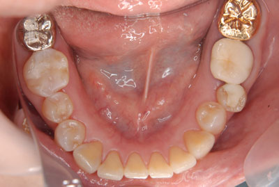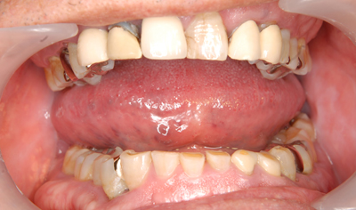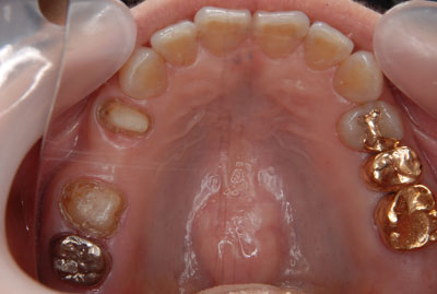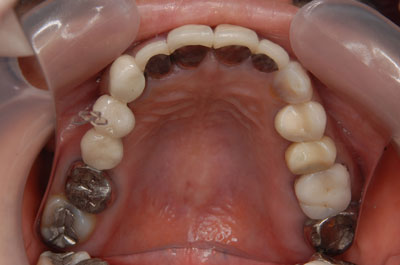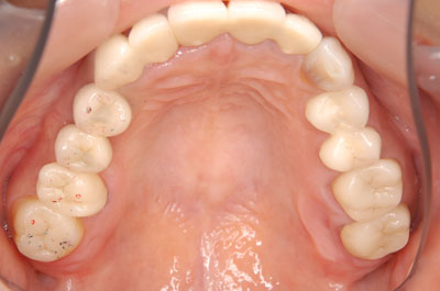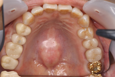 負担のかかるブリッジは選択せず、欠損している部位にはインプラントを埋入。欠損部位は骨の高さが不足している為、ソケットリフト(骨造成)を行った。約4ヶ月の免荷期間を経て、仮歯を装着、リハビリをし、メタルボンド(金属焼付ポーセレン)と、ゴールドクラウンを装着。