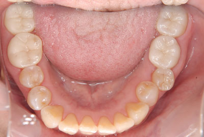 上顎6カ所、下顎5カ所に対しては、e-max(ステイン法)にて、クラウン・インレーをそれぞれの箇所に装着。