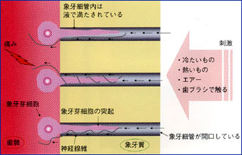 通常食事するときの数倍もの力でこすり合わせるので、歯の表面が著しく磨耗したり、ヒビがはいったりします。また、歯の付け根の部分がえぐれたりもします。そういう状態になると、虫歯でもない歯でもちょっとした刺激で痛みを伴うようになります。歯のなかには毛細血管や知覚神経が存在し、過度の刺激を受けると血管は充血し神経は敏感になります。これが知覚過敏です。