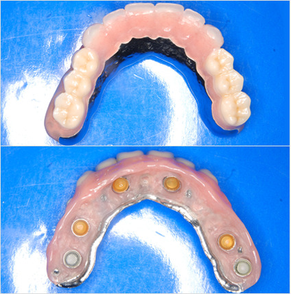 オーバーデンチャーとは、インプラントや残された歯を支持体として使用する入れ歯です。通常の入れ歯は粘膜で支えますが、オーバーデンチャーでは歯やインプラントで入れ歯を支えるため、支持性が高く、しっかり噛めることが大きなメリットです。ご自分で取り外しできる可撤式ですから清掃性が高く清潔を保ちやすくなっています。また、インプラントを用いる場合も埋入本数を少なくできて、費用も抑えられますし、修理も簡単にできます。さらに、審美性の高い治療も可能です。インプラントの数を増やすことで、入れ歯自体のサイズをかなり小さくできるため、違和感も低減できます。 そして、当院では、患者様のお悩みやご希望に合わせるために、シリコン義歯や金属床義歯、マグネット義歯なども提供しています。下の総入れ歯を何度つくり直しても合わない方には、しっかり噛めるシリコン義歯をおすすめします。経年摩耗が少なく、安定した噛み合わせの金属床義歯は、舌感や切れ味が優れていますし、ブレが少なく、外れにくいというメリットがあります。