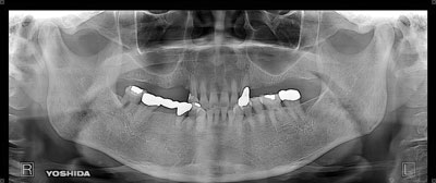 左右上顎第一大臼歯相当は、骨の高さが不足しており、ソケットリフト(骨造成)の必要があり、左右第一小臼歯、第一大臼歯支台のインプラントブリッジを提案。