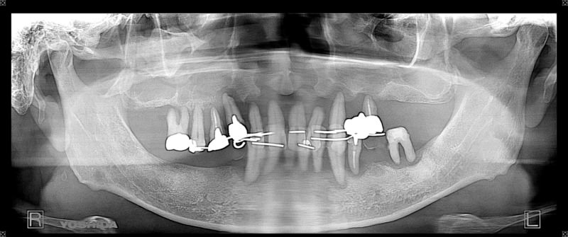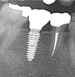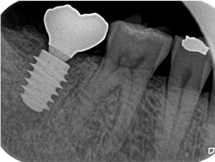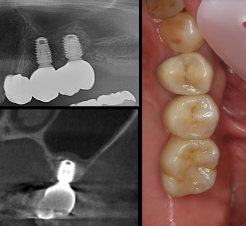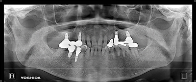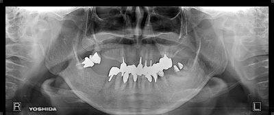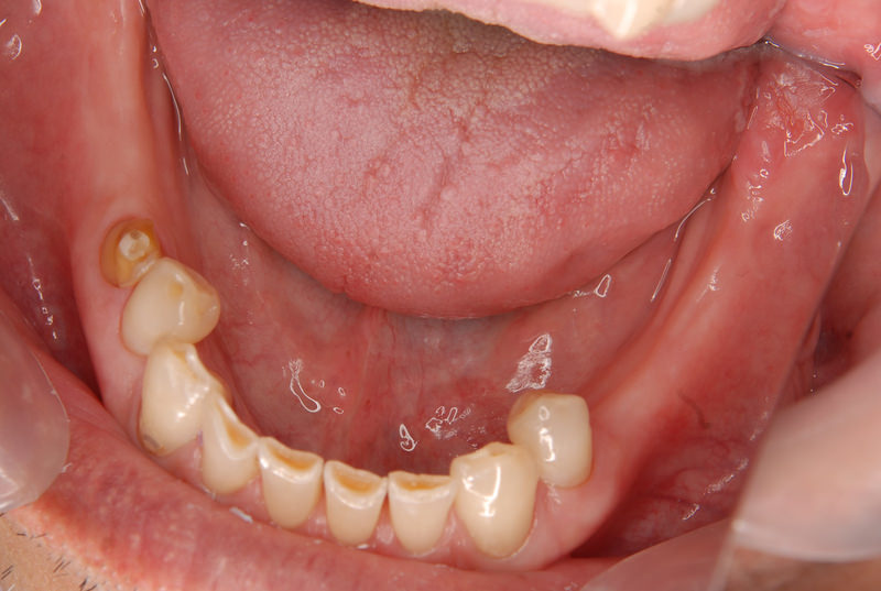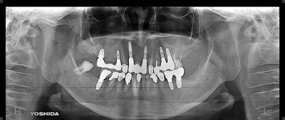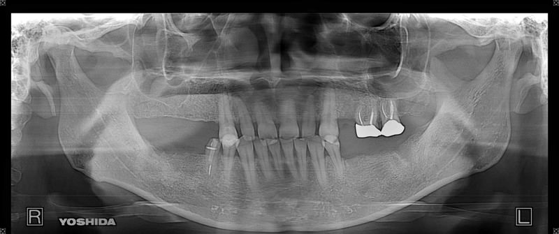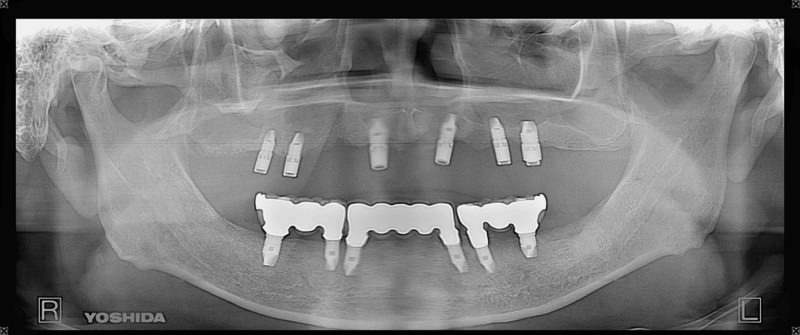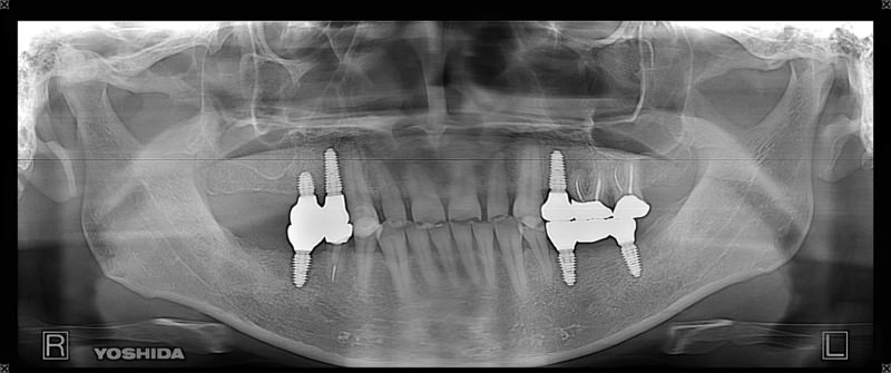 主訴 下顎臼歯部のインプラント周囲炎を併発している。又、上顎臼歯部においては歯周病が進行しており、咀嚼ができない状態である。インプラント周囲炎に関しては、インプラント体を撤去し力学的に安定した位置に1本のみ埋入。