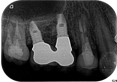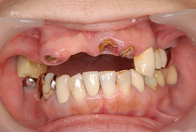 上顎前歯部、左上臼歯部にはブリッジが装着されていて、支台歯に負担がかかっており、力学的配慮設計を重視し、固定制のインプラントを提案。