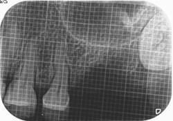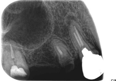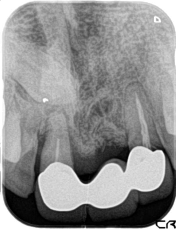 右上第二小臼歯はC₄にて抜歯。右上第一大臼歯は欠損の状態。