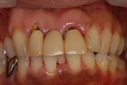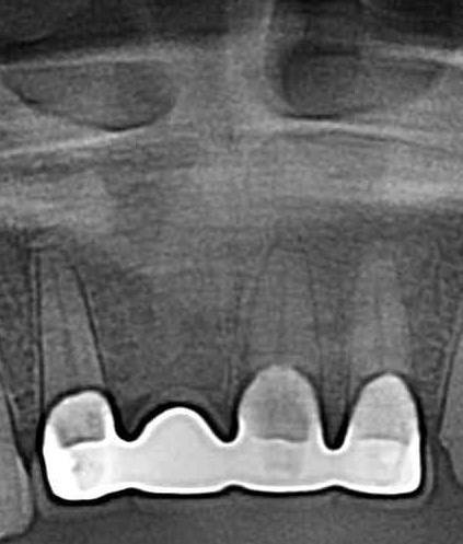 主訴 前歯部ブリッジの動揺の為来院。歯ぎしり、喰いしばりによる力の影響である為、つなげるブリッジではなく、インプラントを選択。インプラント埋入と同時に即時荷重非接触型の仮歯を装着。