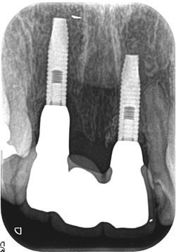 主訴 上顎前歯部2本の歯根破折の為に来院。義歯は留め金が見えることに抵抗があり、ブリッジは健全な歯を削って被せることから、最終的には力学的に強いインプラントを選択。
