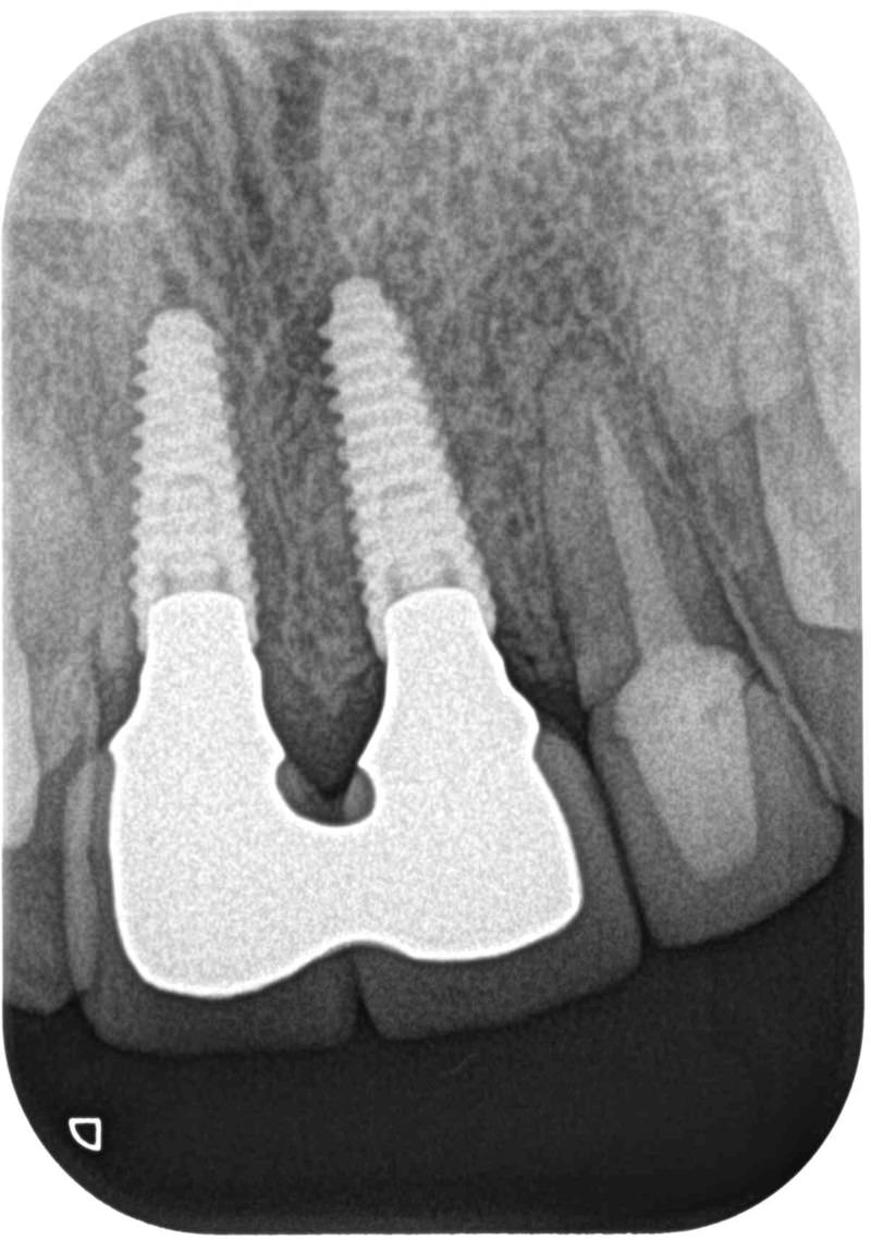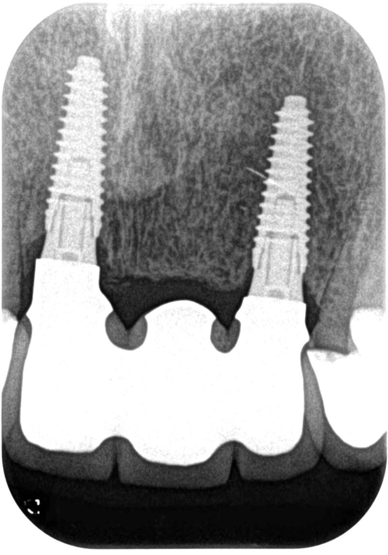 抜歯と同時に、2本のインプラントを埋入。ギャップには採血によって得られた、AFGブロック(人工骨とAFGを混ぜたブロック)を填入。免荷期間中は接着の仮歯を隣接歯に固定し、約3ヶ月の免荷期間を経て、仮歯のインプランブリッジを装着、約4ヶ月後にメタルボンドブリッジ(金属焼付ポーセレン)を装着。