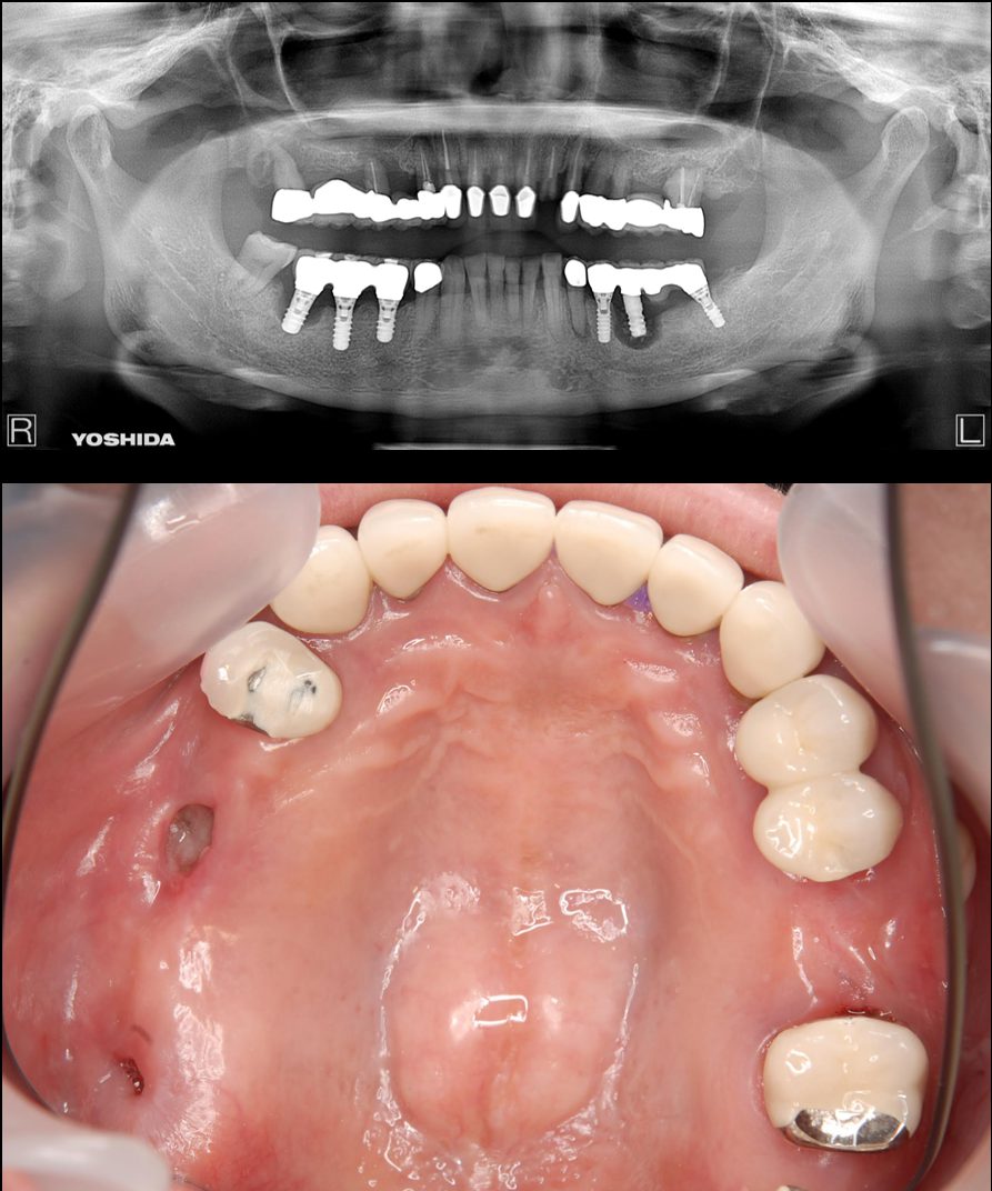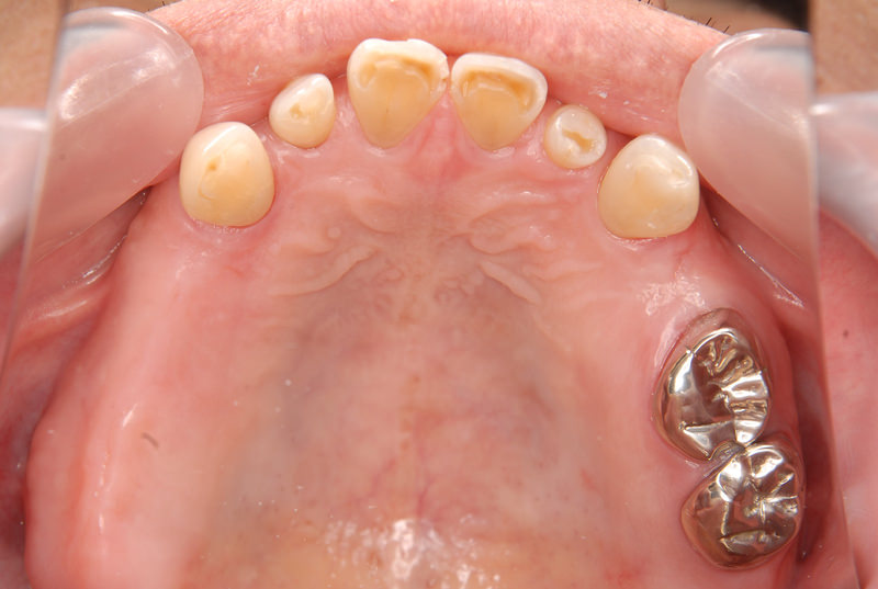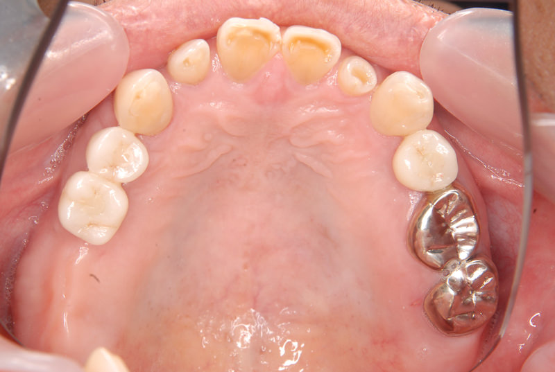 主訴 上顎のみ部分義歯を使用しているが、入れ歯が煩わしい、固定制のインプラントにして欲しいと来院。