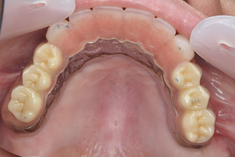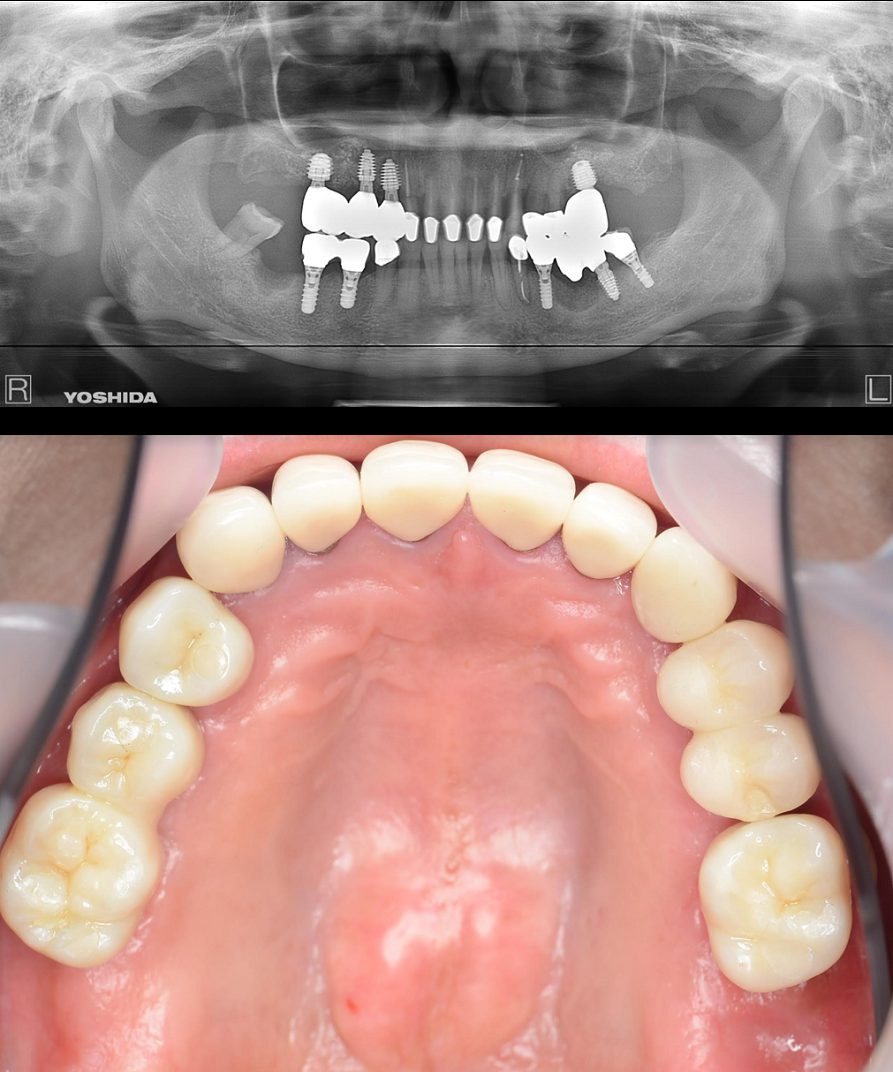 上顎左右臼歯部の4本は、骨の高さが不足していた為、ソケットリフト(骨造成)を採用。免荷期間を経て、ケラターアタッチメントを用いたオーバーデンチャーを装着。人工歯のメタルアップにはジルコニアを選択。