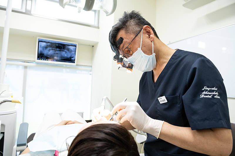 虫歯が進行して神経(歯髄)にまで到達している場合、歯と神経の感染している部分を完全に除去する根管治療を行う必要があります。根管治療は、深い知識と高い技術力を要求される治療です。根の部分まで伸びていて細く、複雑な形状をしているため、正確な診断も不可欠です。当院では、CT検査によって根の長さや形状、炎症の範囲や状態を正確に把握して診断しています。その上で歯科拡大鏡を用いて肉眼では確認できないレベルの精密な治療を行っています。充填、土台と被せ物、そして噛み合わせのコントロールまで丁寧に行うことで、患者様の健康な状態の歯をできるだけ長く保てるようにしています。