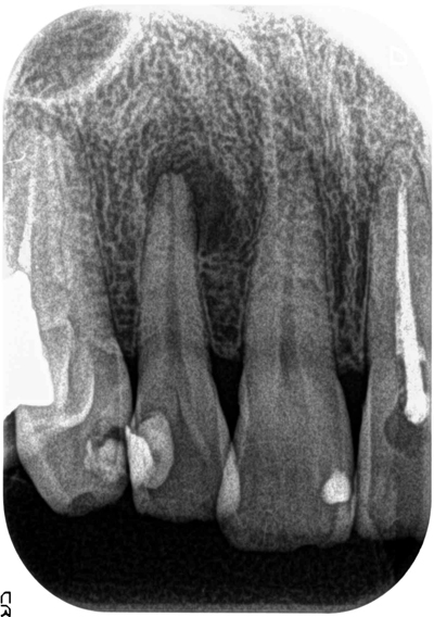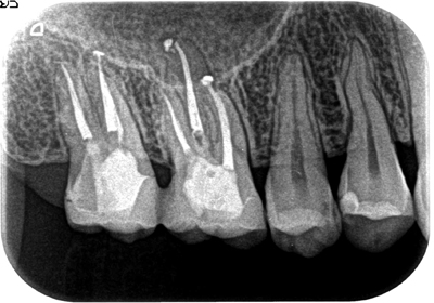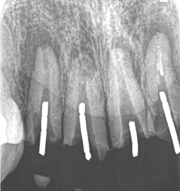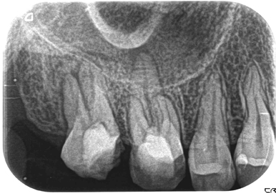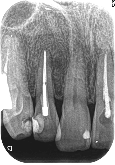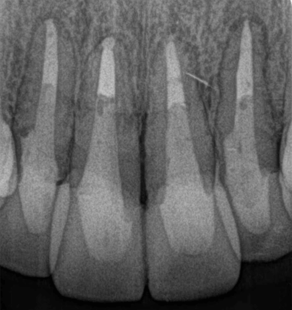 症例2【40代男性】右上側切歯の歯髄壊死。根管内も殺菌・消毒を約4ヶ月間行うことにより、病巣はほぼ消失し、硬線が明瞭に見える。