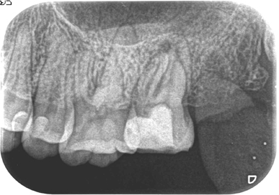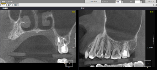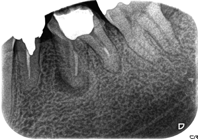 根管内の殺菌・消毒を約3ヶ月間行うことにより、病巣はほぼ消失、硬線が明瞭に見える。