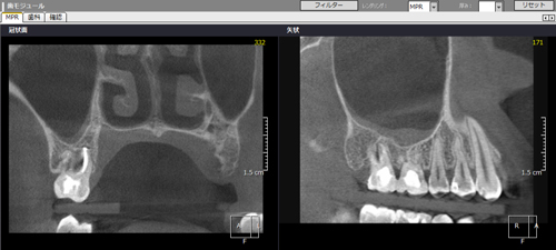 症例1【30代女性】右上7番根尖相当部に大きな病巣がみられ、副鼻腔の粘膜にも波及し、肥厚している。15ヶ月後、病巣はほぼ消失し、骨が再生、副鼻腔粘膜の肥厚も消失。